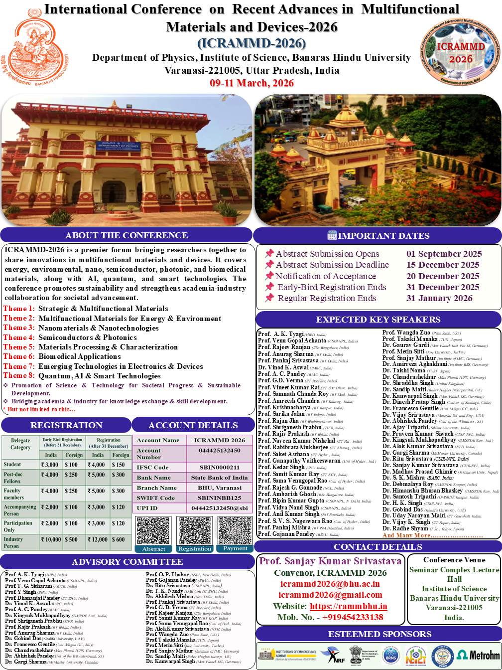 The International Conference on Recent Advances in Multifunctional Materials and Devices 2026 (ICRAMMD-2026) is a premier forum uniting researchers and innovators to share transformative ideas. The scope encompasses strategic and multifunctional materials, including composites, adaptive polymers, alloys, and defense technologies. Advances in Energy & Environmental Materials will highlight photovoltaics, storage, fuel cells, and sustainable construction, while Nanomaterials & Nanotechnologies showcase 0D/1D/2D systems, hybrid architectures, and nanosensors. Sessions on Semiconductors & Photonics explore optoelectronics, spintronics, and fiber optics, complemented by the processing and characterization of materials through advanced synthesis, printing, and surface engineering. In the biomedical domain, focus areas include tissue engineering, biodegradable systems, and biosensors. Multifunctional Devices such as wearables, MEMS, and nuclear sensors will be emphasized, alongside AI, Quantum, & Smart Technologies shaping computational design and smart laboratories. Beyond scientific advances, the conference emphasizes the promotion of science and technology for sustainable development, thereby strengthening academia–industry linkages for the benefit of society.